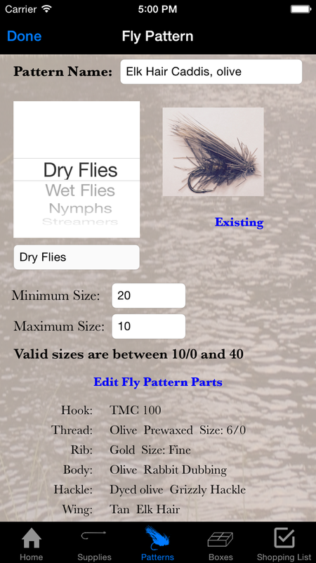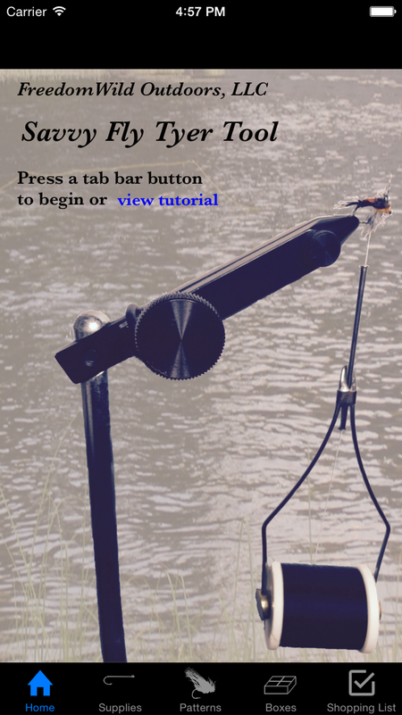 Have you ever sat down to tie a fly just to find that you forgot to buy a supply you need at the store? Have you ever thought you had a fly in your fishing vest just to find that it wasn't there once you were on the water? Tired of searching through books full of fly-patterns for the one you want to tie? This App can solve these problems for you.