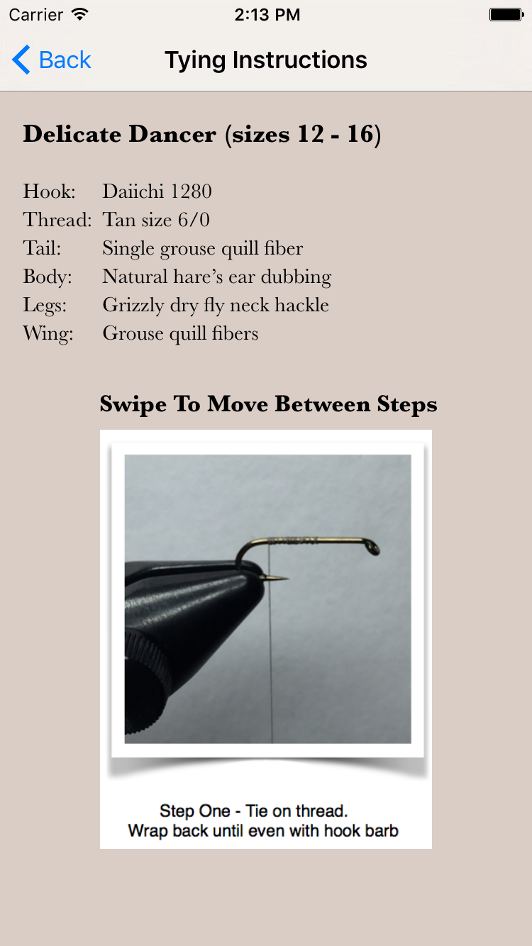 - Store your favorite fly patterns right on your phone. Display them quickly at the touch of a button. No more searching through books, or trying to keep a book open to a certain page while you're tying.